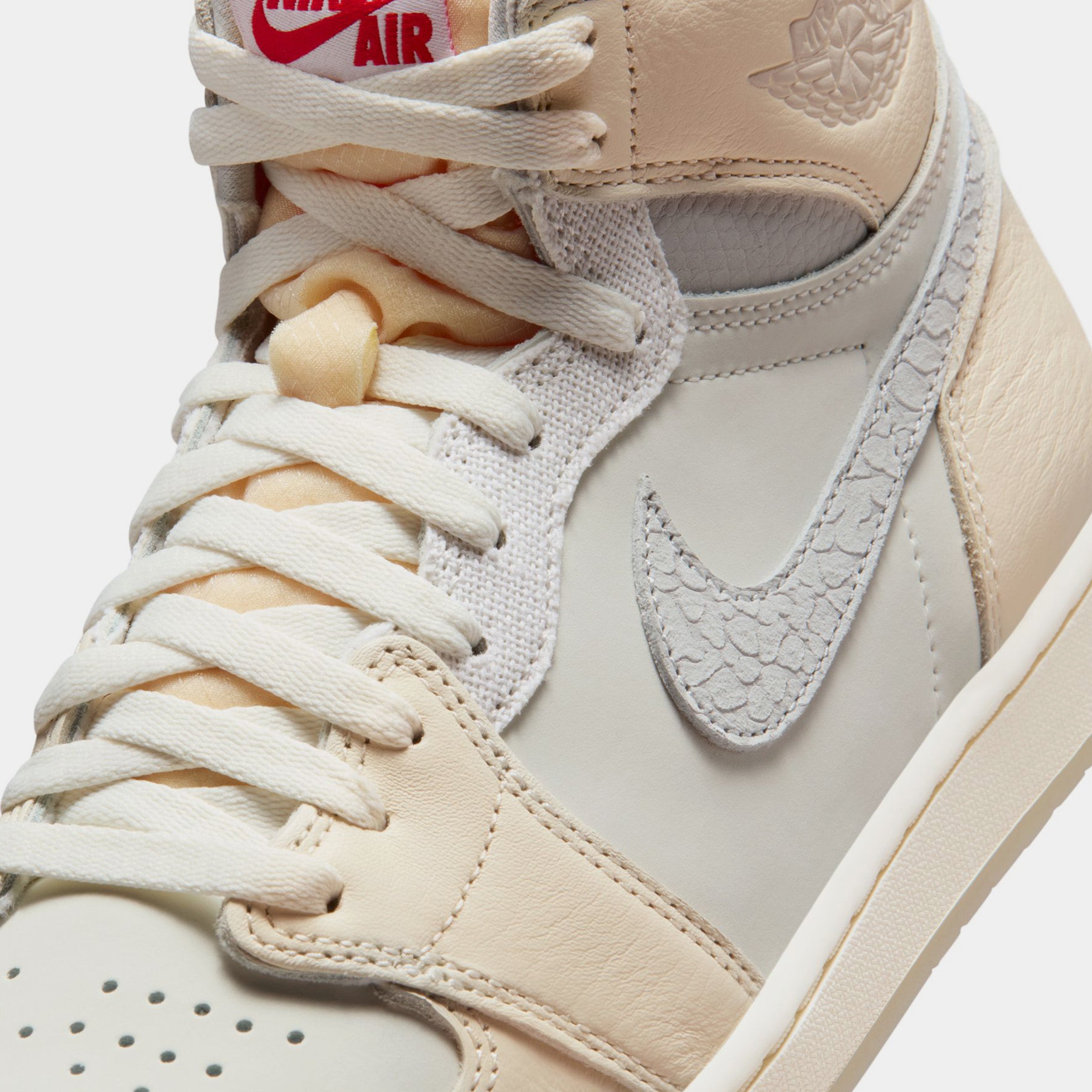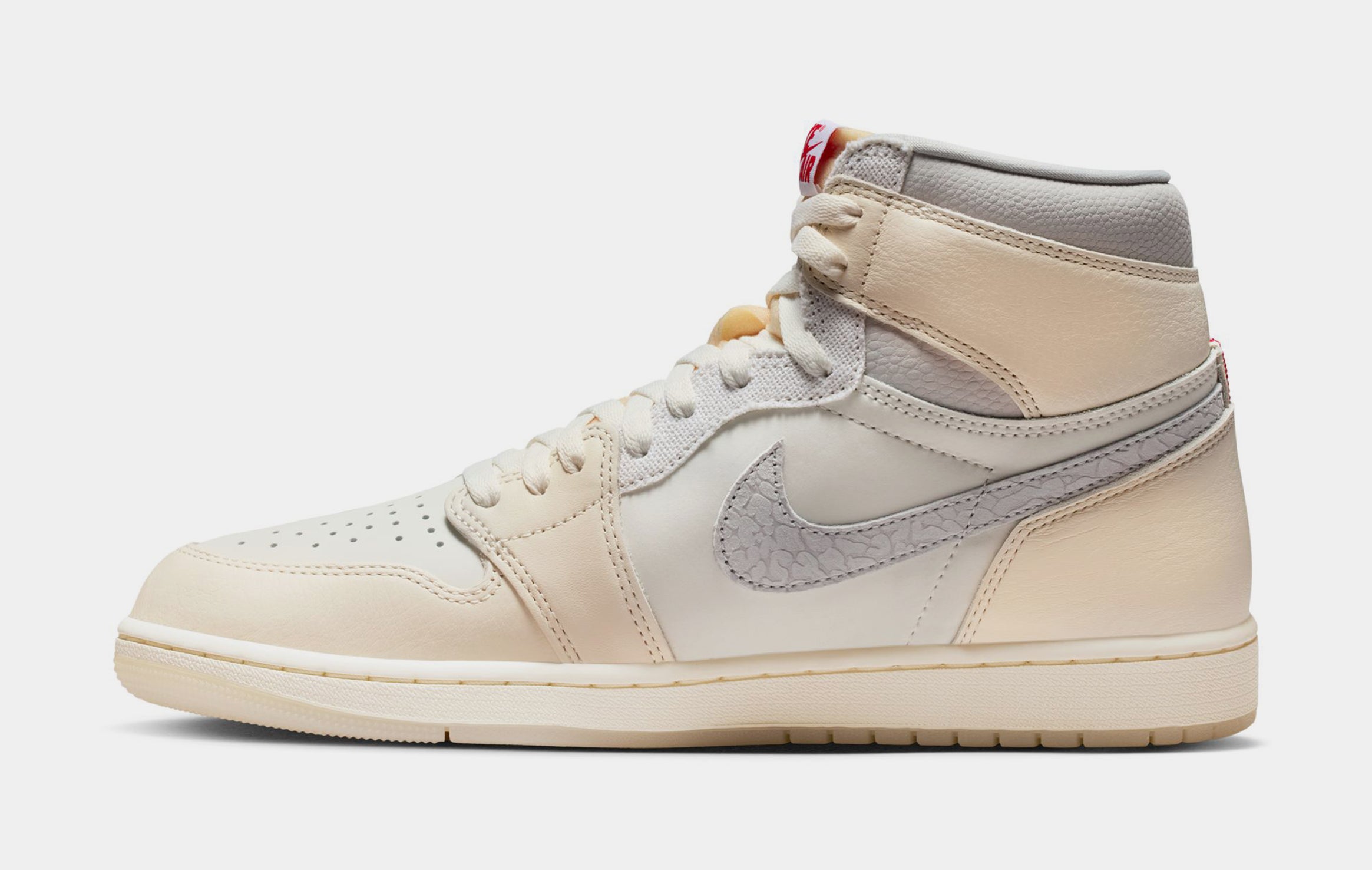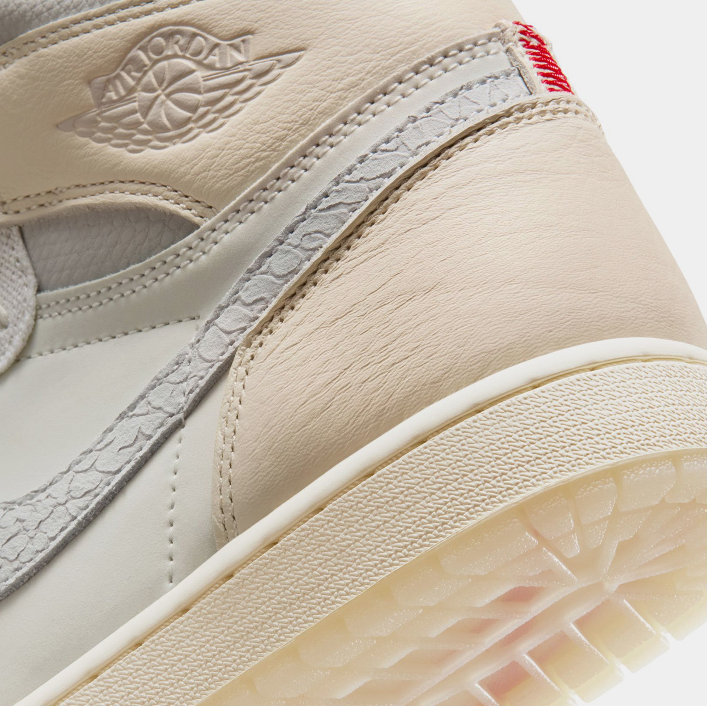 This upcoming Air Jordan 1 is expected to feature a premium sail-colored leather upper, creating a slightly aged aesthetic that pays homage to the brand??s heritage. Complementing the neutral base are vibrant University Red accents applied to the iconic Nike Swoosh, Wings logo, and outsole, delivering a bold contrast that elevates the overall design.