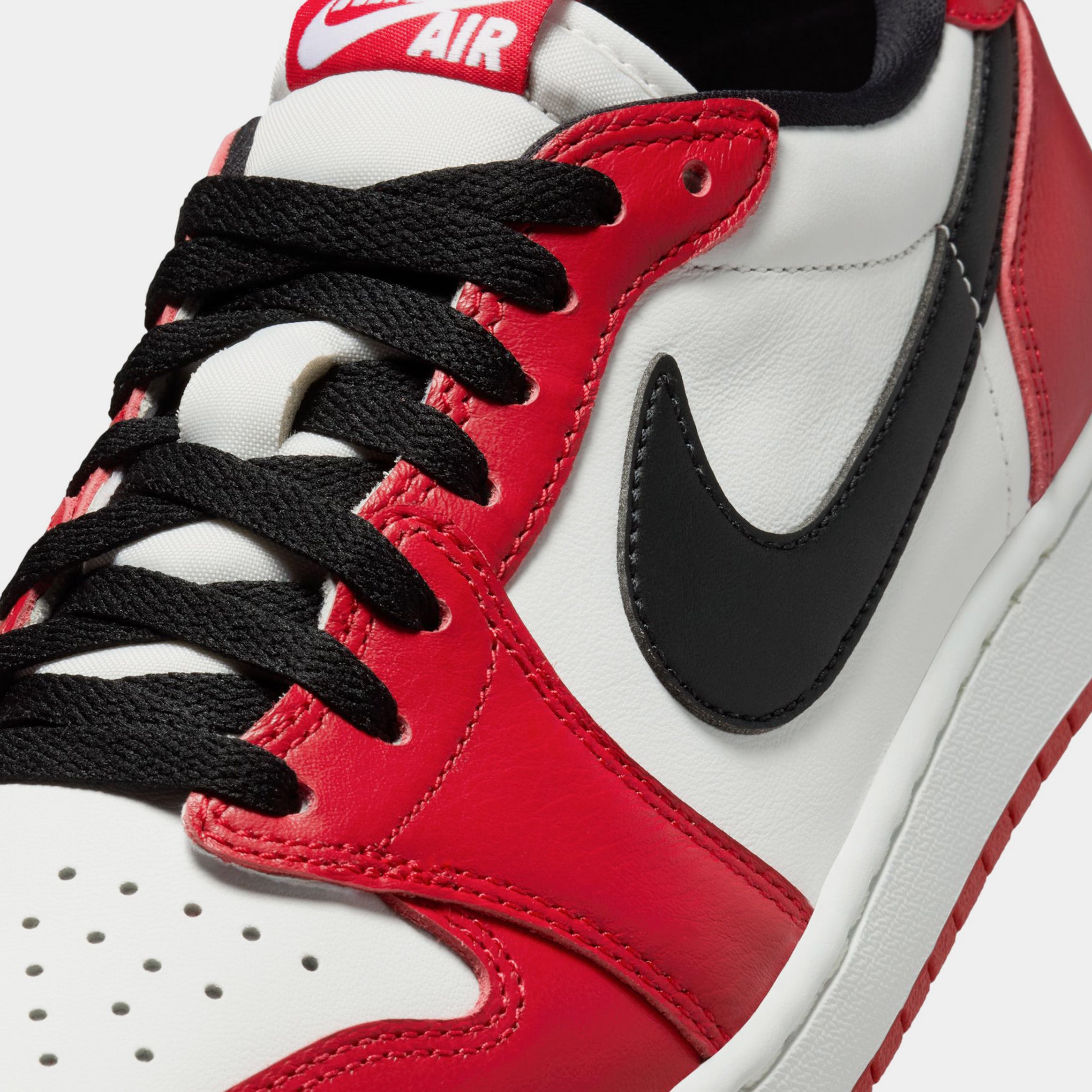 The Air Jordan 1 Low OG ??Chicago?? returns for Holiday 2025, celebrating the timeless legacy of the iconic colorway. Originally a 1985 high-top and reimagined as a low-top in 2016, this classic silhouette combines vintage appeal with bold style. Crafted from premium leather, it features a striking Varsity Red, Black, and Summit White palette, with red on the eyestays, toe, heel, and outsole, crisp white panels and midsole, and black accents on the Swoosh, laces, lining, and Wings logo for a perfectly balanced, standout look.