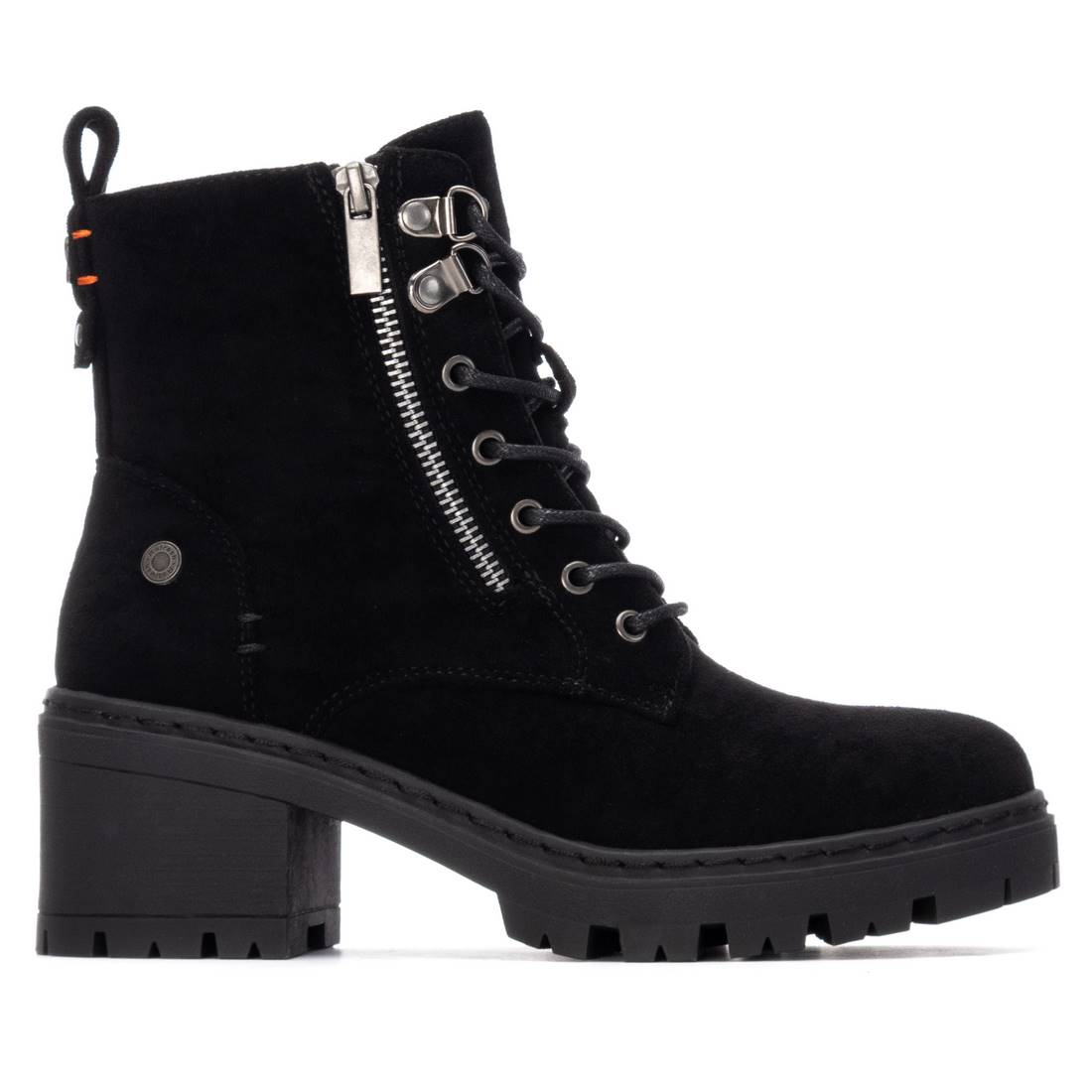 Botín de mujer, de la marca Refresh. Fabricado en una suave antelina. Cremallera lateral decorativa. Cierre mediante cremallera interior con cordones regulables. Tirador trasero para facilitar el calce. Suela track antideslizante con tacón y plataforma para mayor comodidad. Con plantilla extraíble. Este modelo ha obtenido el certificado vegano por la organización mundial PETA (Organización de los derechos de los animales).