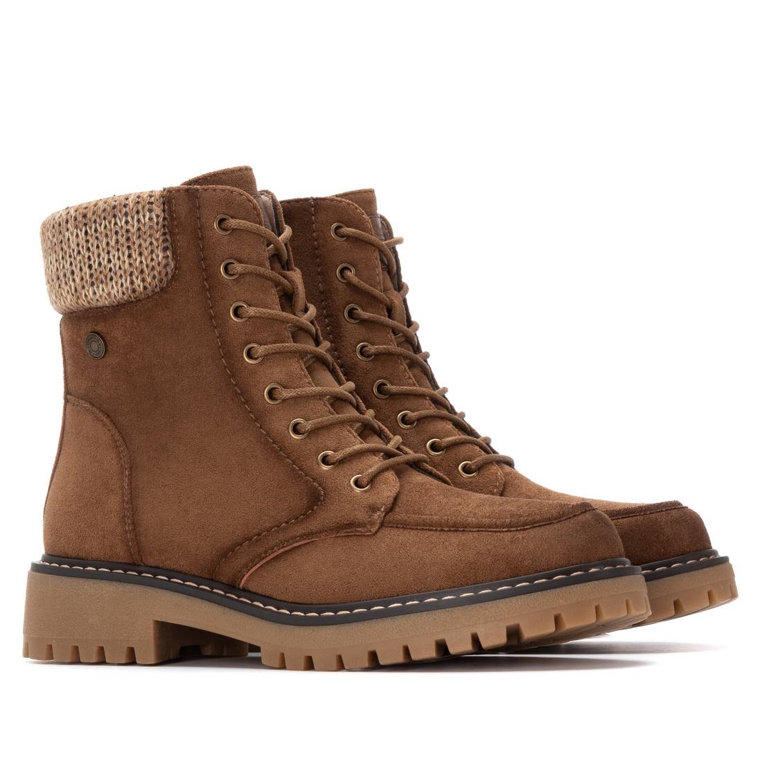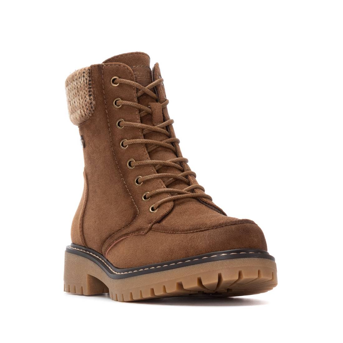 Botín de mujer, de la marca Refresh. Fabricado en suave antelina con collarín acolchado de tejido. Cierre mediante cremallera interior. Cordones regulables al tono. Gruesa suela de goma antideslizante. Con plantilla extraíble. Este modelo ha obtenido el certificado vegano por la organización mundial PETA (Organización de los derechos de los animales).