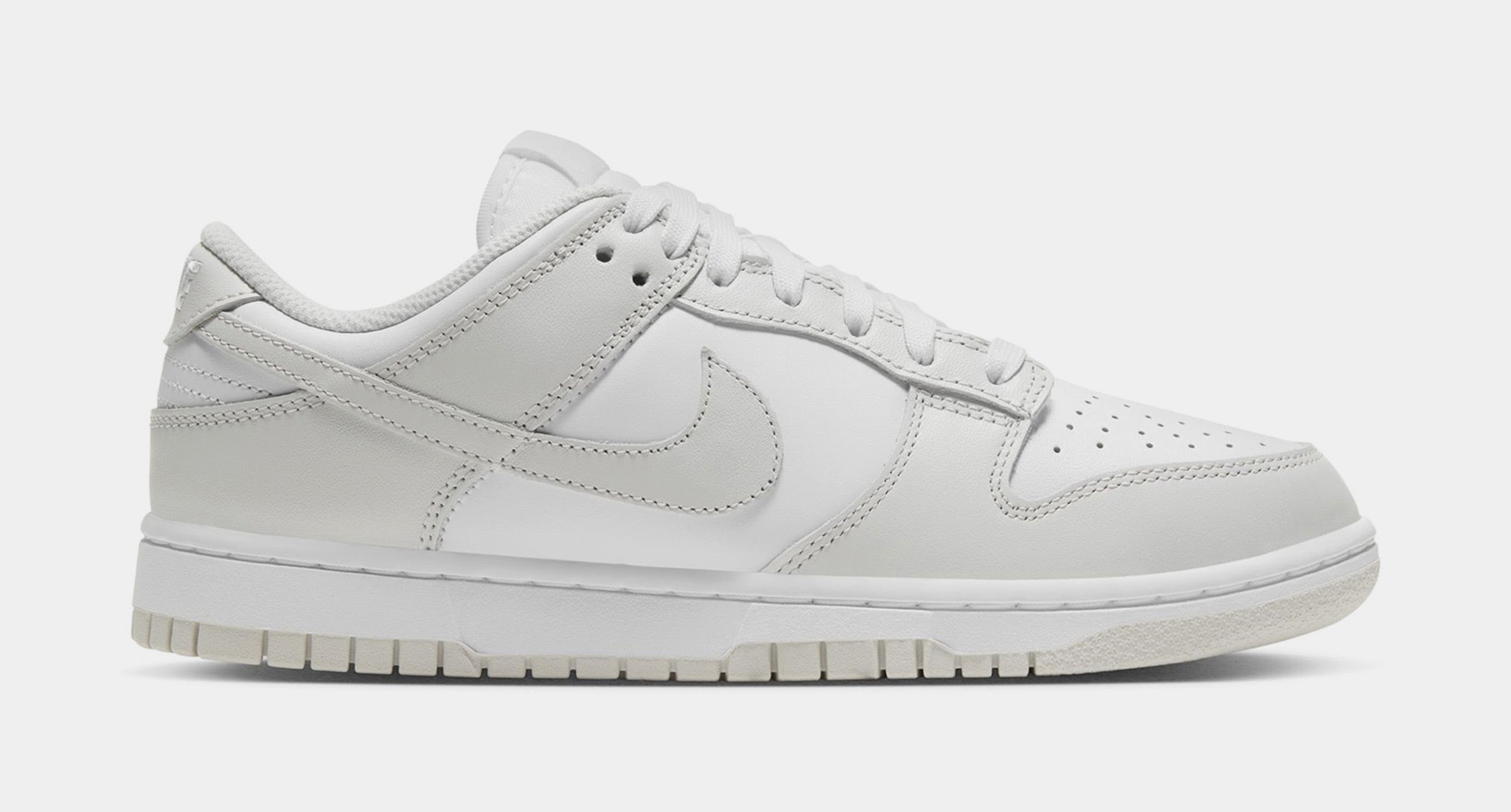 Dressed in a White and Photon Dust color scheme. This Nike Dunk Low features a White leather base with a light shade of Grey used on the overlays, Swooshes, heels, and rubber outsole. A White midsole and Black branding on the insoles completes the design.