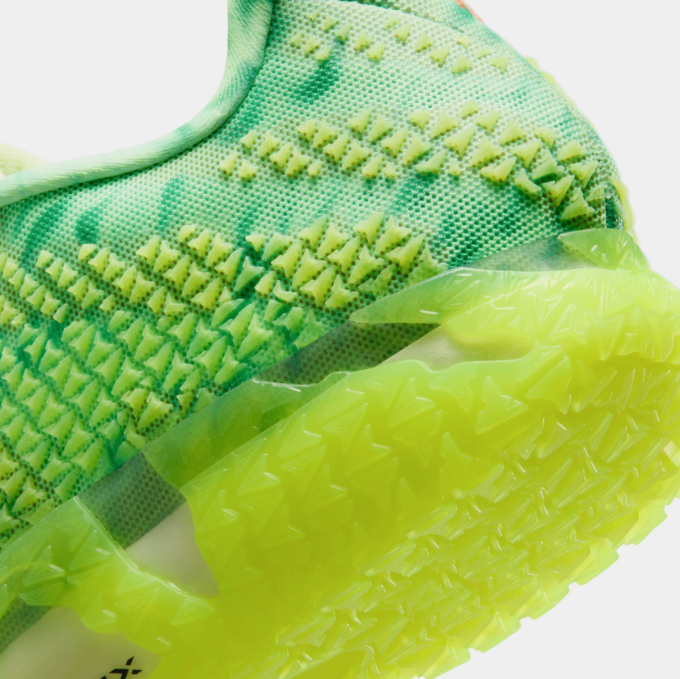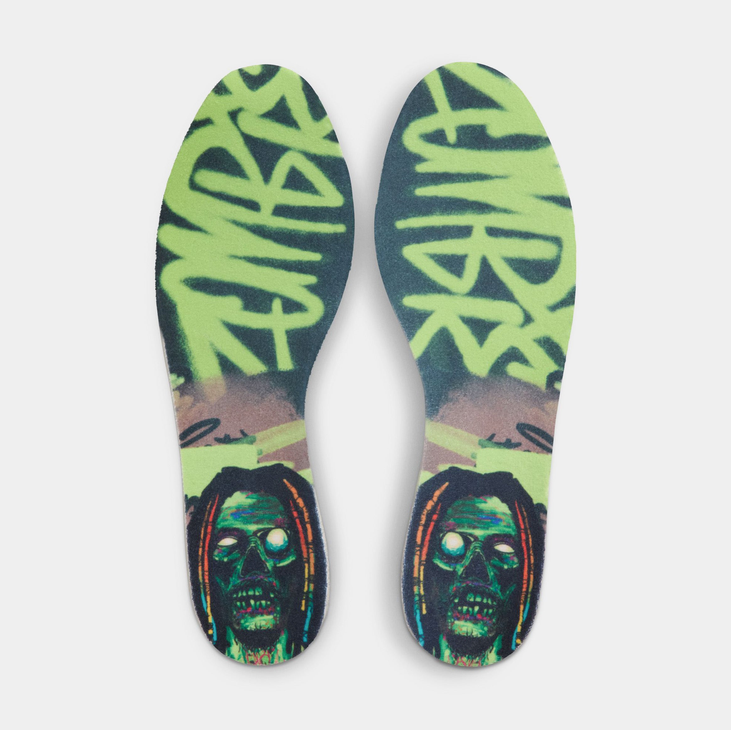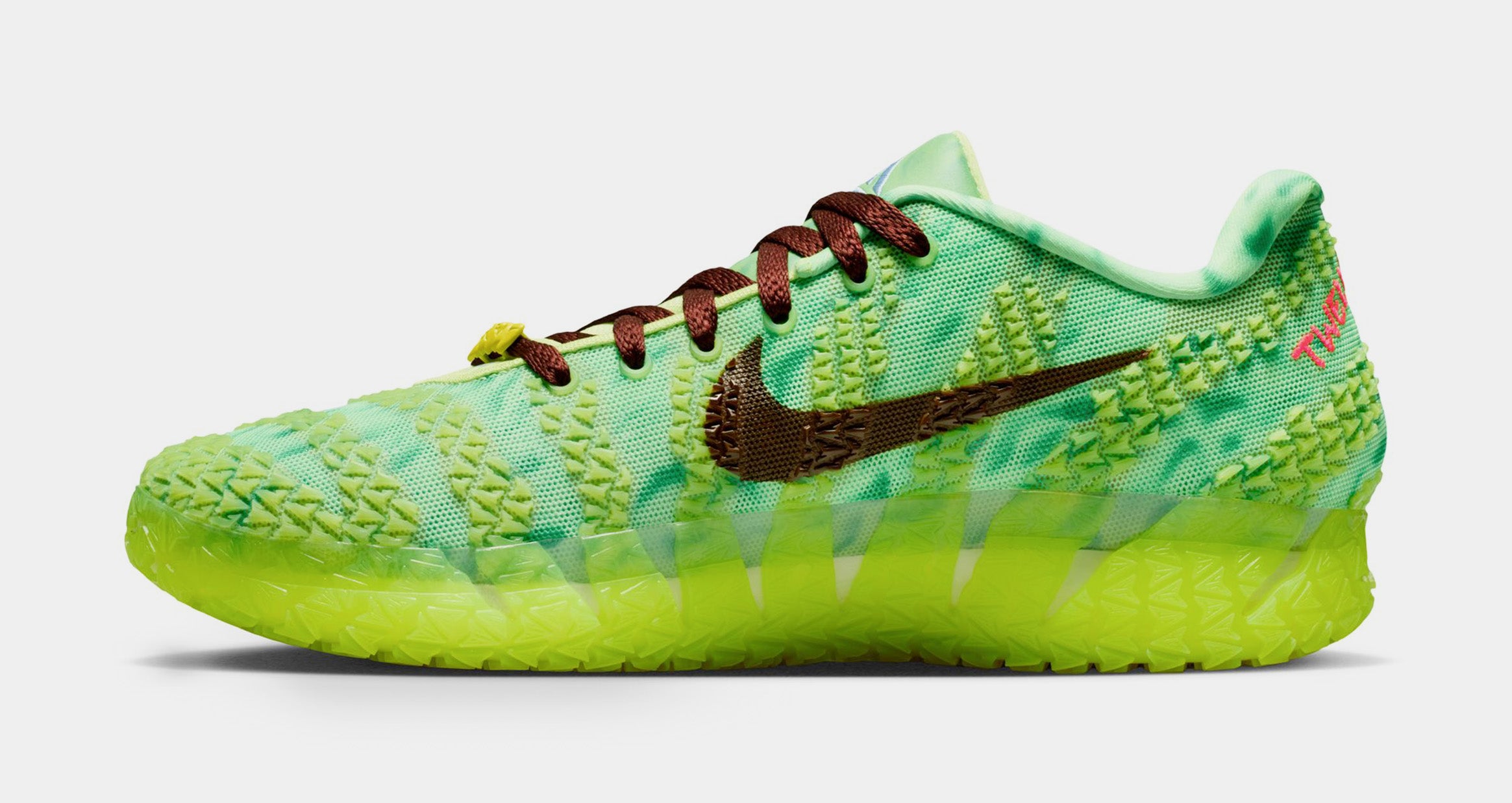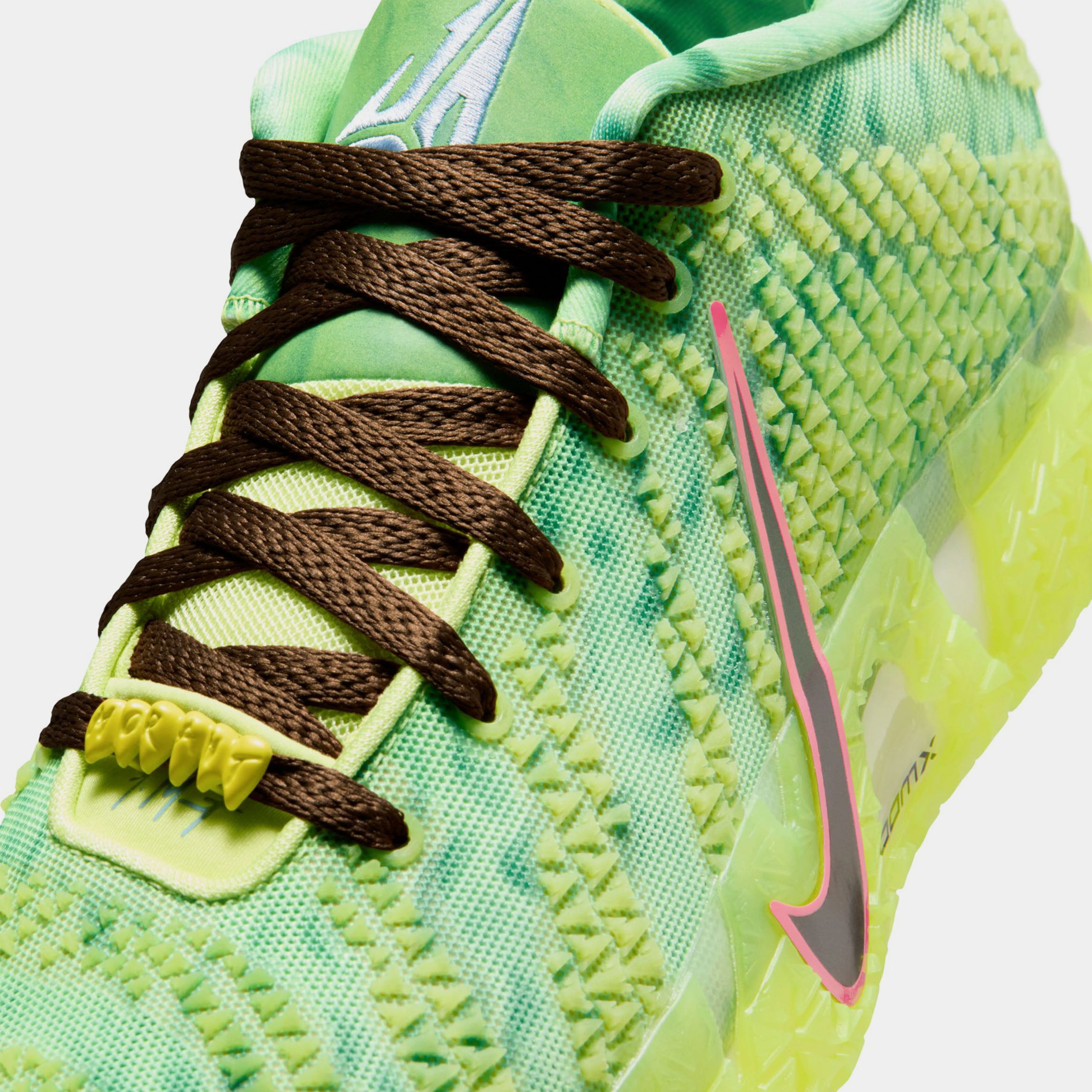 The Nike Ja 3 ‘Zombie’ celebrates Halloween with a patterned bright green mesh upper, featuring monogram-pattern overlays that utilize Ja Morant’s ‘JA’ logo. Outlined in crimson trim, a black vertical Swoosh on the lateral side panel extends into the neon green rubber cupsole, which houses full-length ZoomX foam cushioning with a midfoot shank for torsional rigidity. Unique details include fanged ‘MORANT’ lace dubraes and a sinister zombie graphic on the custom sockliner.