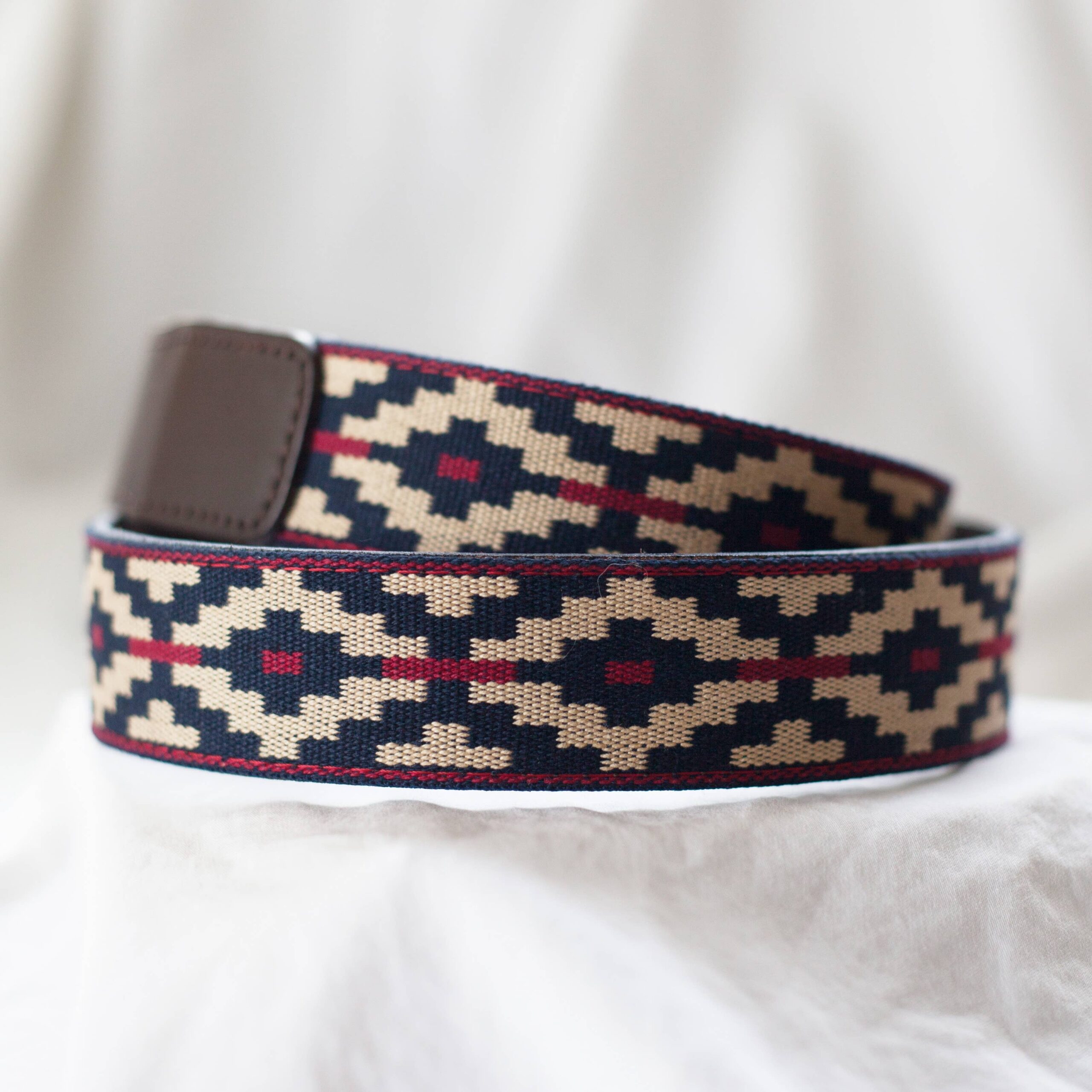 Cotton, vegetable tanned leather, and solid brass buckle