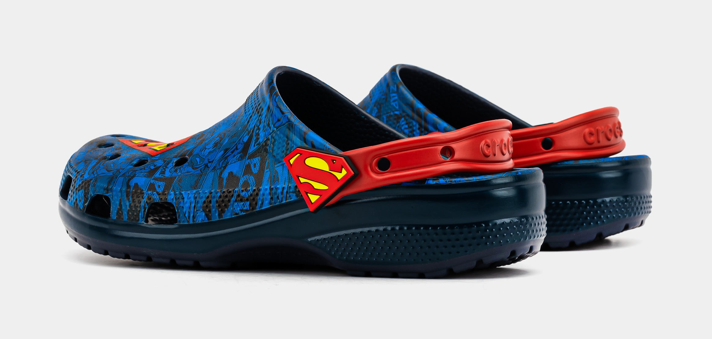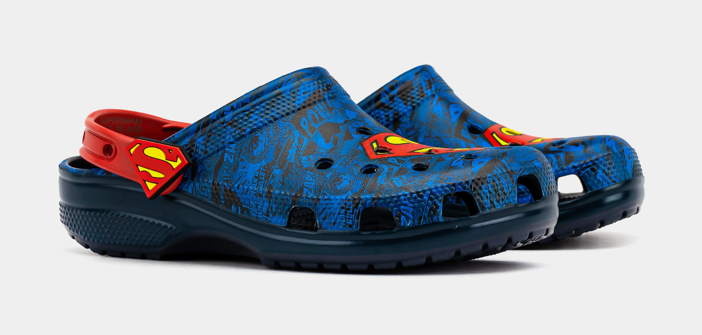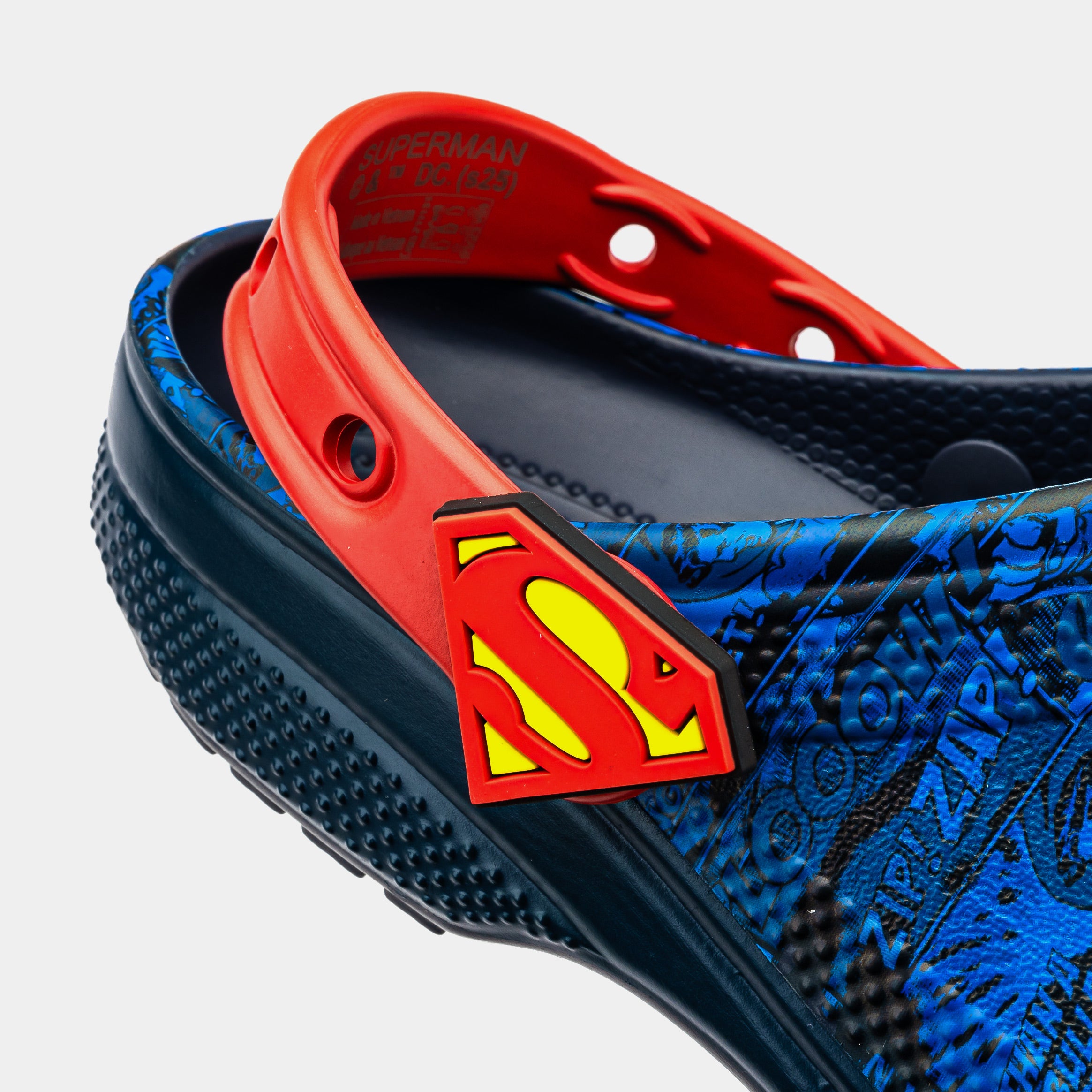 The Superman collection has landed. And the classic Super Hero inspired this Classic Clog. An allover comic book print serves as the background. But the real hero of the design is the Superman S-shield on the upper and rivets. It’s style with a capital “S”.